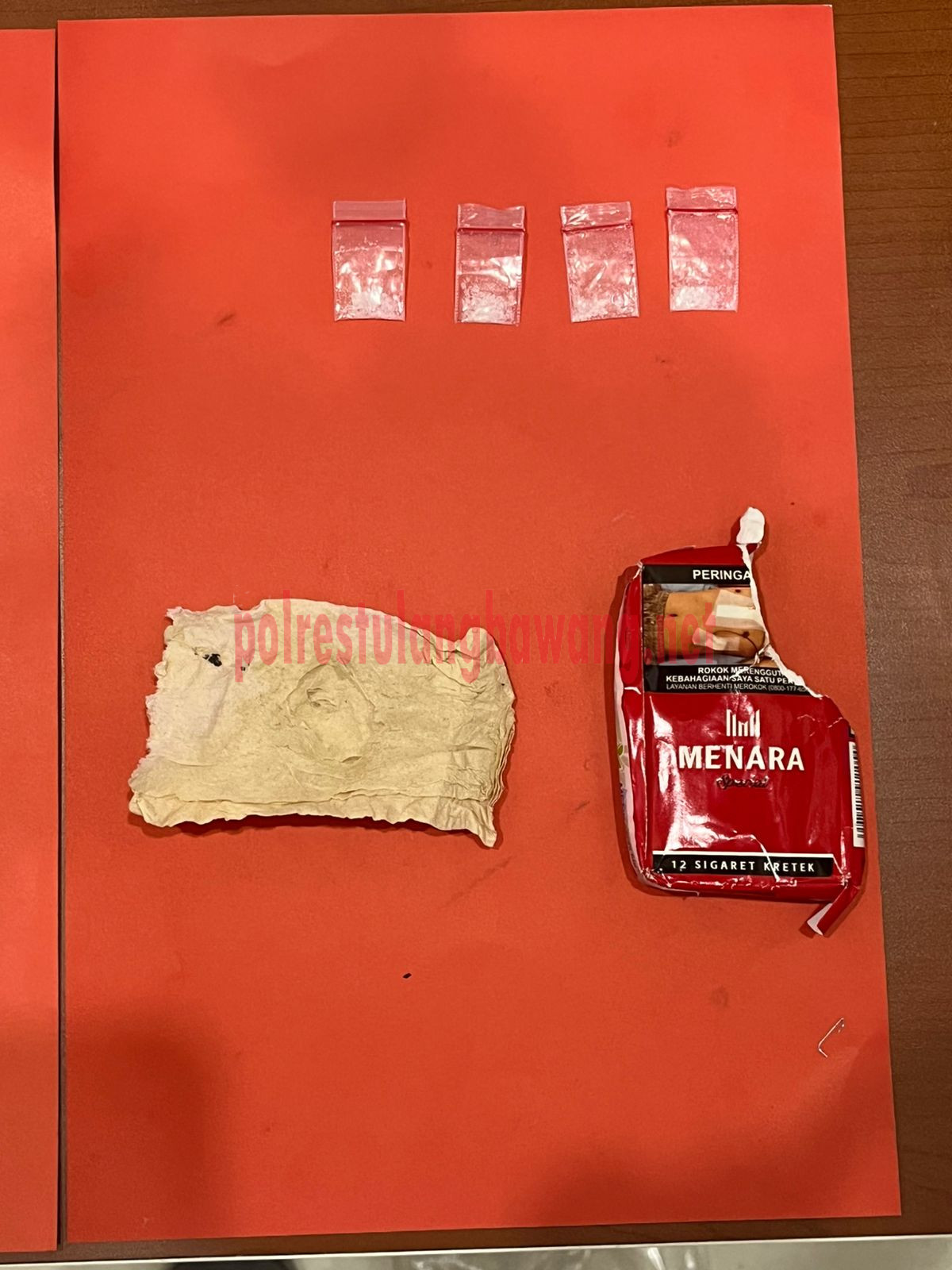 Dari tangan tersangka, petugas berhasil mengamankan 4 bungkus plastik klip berisi sabu, satu kotak rokok merek Menara yang dijadikan tempat penyimpanan, satu lembar kertas timah, sepeda motor Yamaha Mio warna putih, dan satu unit ponsel merek Vivo yang diduga digunakan untuk berkomunikasi dalam transaksi.